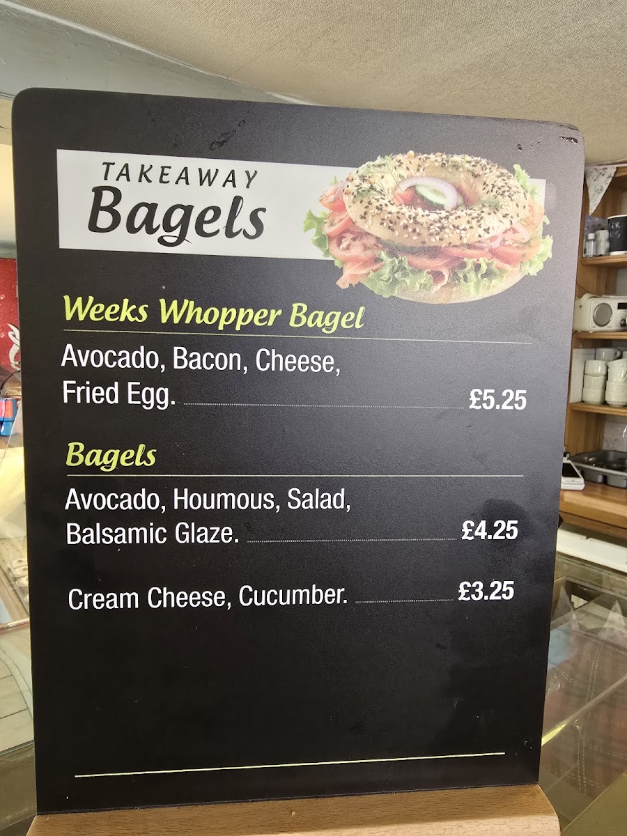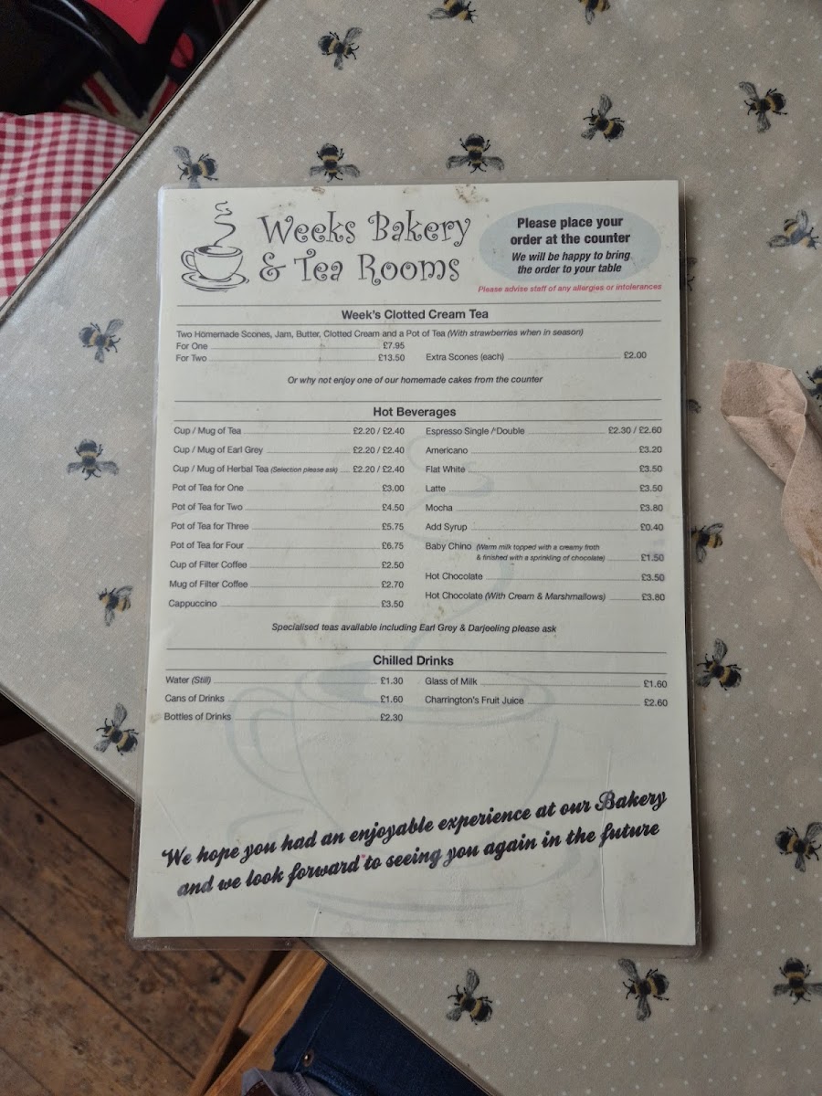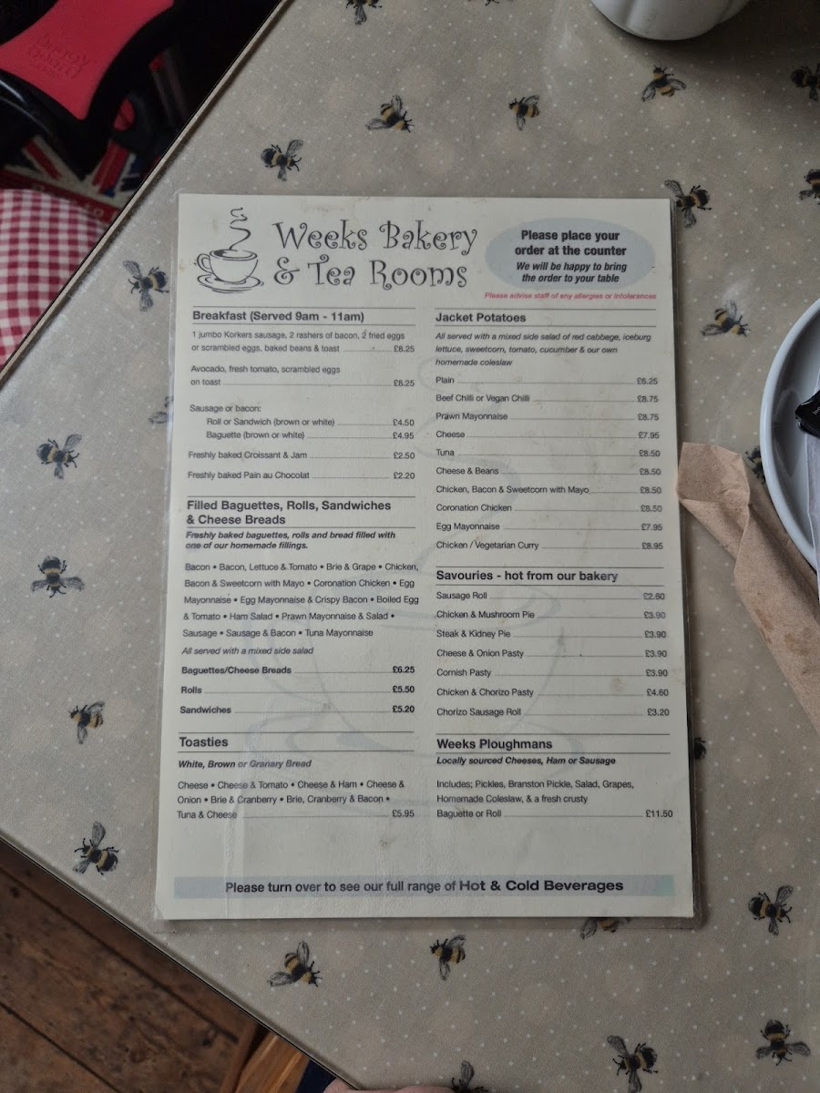 Overall, the menu at Weeks Bakery & Tea Rooms offers a comforting and traditional selection that feels both hearty and satisfying. The Jacket Potatoes range-from simple plain options to more indulgent fillings like Beef Chilli, Vegan Chilli, and Prawn Mayonnaise-provides something for every appetite, while classic combinations such as Cheese and Tuna keep things familiar. The variety of Filled Baguettes, Rolls, Sandwiches & Cheese Breads, including Baguettes/Cheese Breads and Rolls, ensures plenty of choice for a light lunch. Standout bakery items like the Sausage Roll, Chicken & Mushroom Pie, Steak & Kidney Pie, Cheese & Onion Pasty, and Cornish Pasty highlight the café’s strength in warm, savory pastries. For something lighter or sweet, options such as the Freshly Baked Croissant & Jam and Freshly Baked Pain Au Chocolat are delightful, while more filling choices like the Weeks Whopper Bagel and combinations like Chicken, Bacon & Sweetcorn add variety. Although prices are not listed, the menu reflects a classic British bakery experience with a good balance of savory comfort foods and baked treats, making it an inviting stop for a casual and satisfying meal.